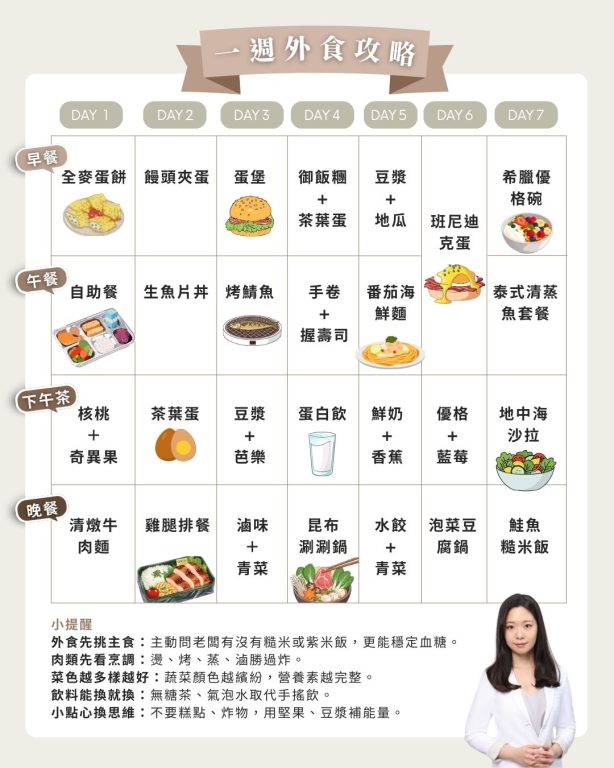 您是不是常常忙到沒時間煮飯,只能外面餐廳買一買解決一餐?便當、麵店、便利商店成了生活日常,甚至不餓就不吃正餐,隨手抓一個餅乾果腹。長期下來,血壓、血糖、血脂可能都在悄悄升高,體檢完看到紅字一年比一年多,卻在每年體檢後依舊無所適從。其實,外食不等於不健康,心血管飲食的核心就是「多樣化、少加工、優質比例」。如果您一直找不到頭緒,不妨試試正欣診所營養師整理的一週「外食族心血管保護攻略」,讓您在外食選擇上,包含早餐、午餐、下午點心、晚餐,下午時段不必怕挨餓,若能利用無調味堅果、希臘優格、無糖豆漿、茶葉蛋、水果等輕食補充能量,還能讓血糖與情緒更穩定。